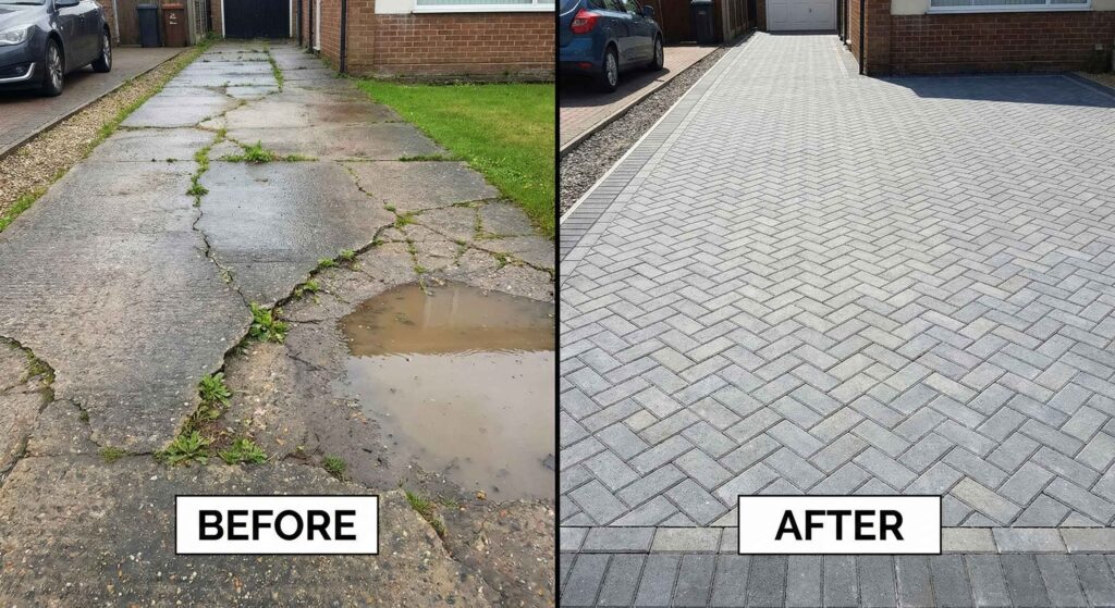 • Drainage & SUDS Compliance: We ensure your driveway complies with UK planning rules regarding surface water. We install Aco drains and soakaways to ensure rainwater runs off effectively, protecting your garage and home from damp.