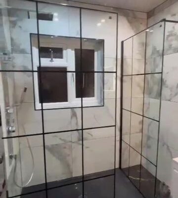 Designer Bathrooms: The en-suite features floor-to-ceiling marble-effect tiling, a contemporary black-framed “Crittall-style” shower enclosure, and premium matte-black fixtures.