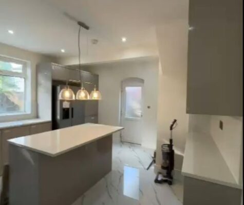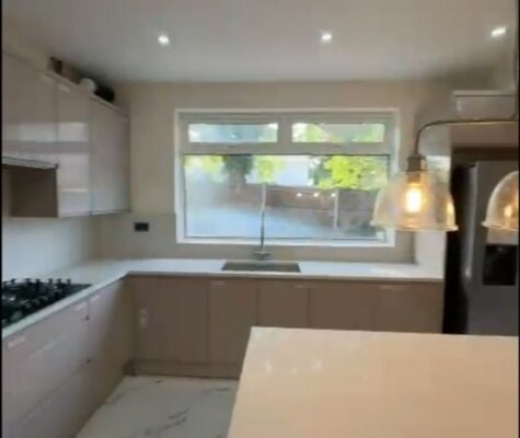 Designer Kitchen: Installation of a high-gloss kitchen featuring a central island and stone countertops.