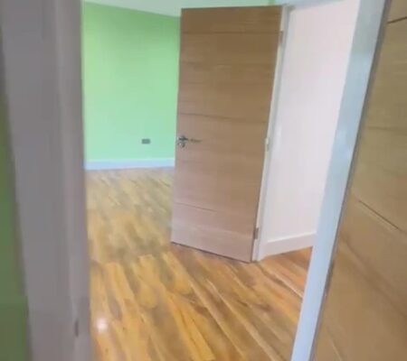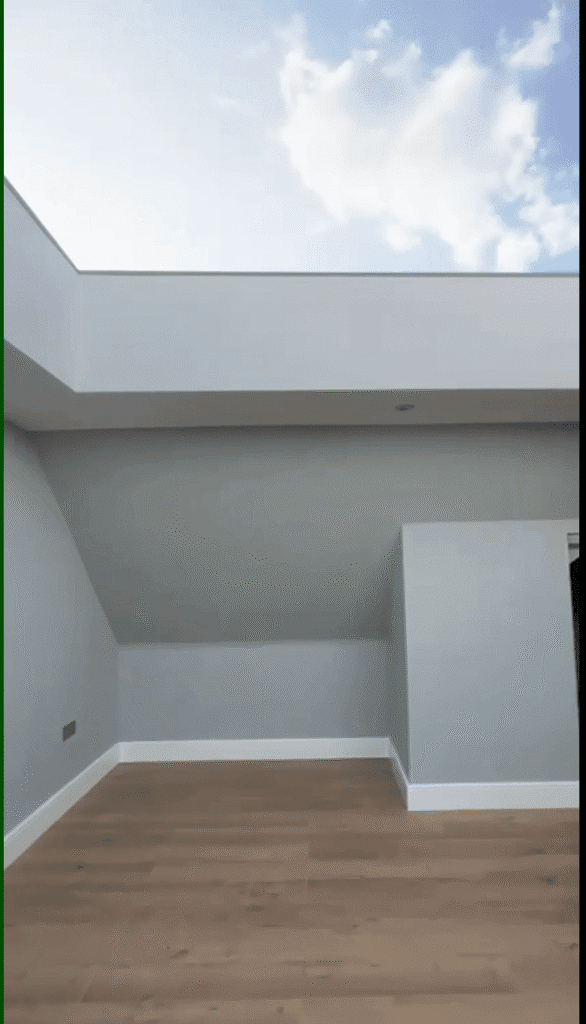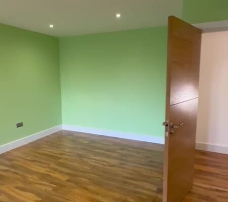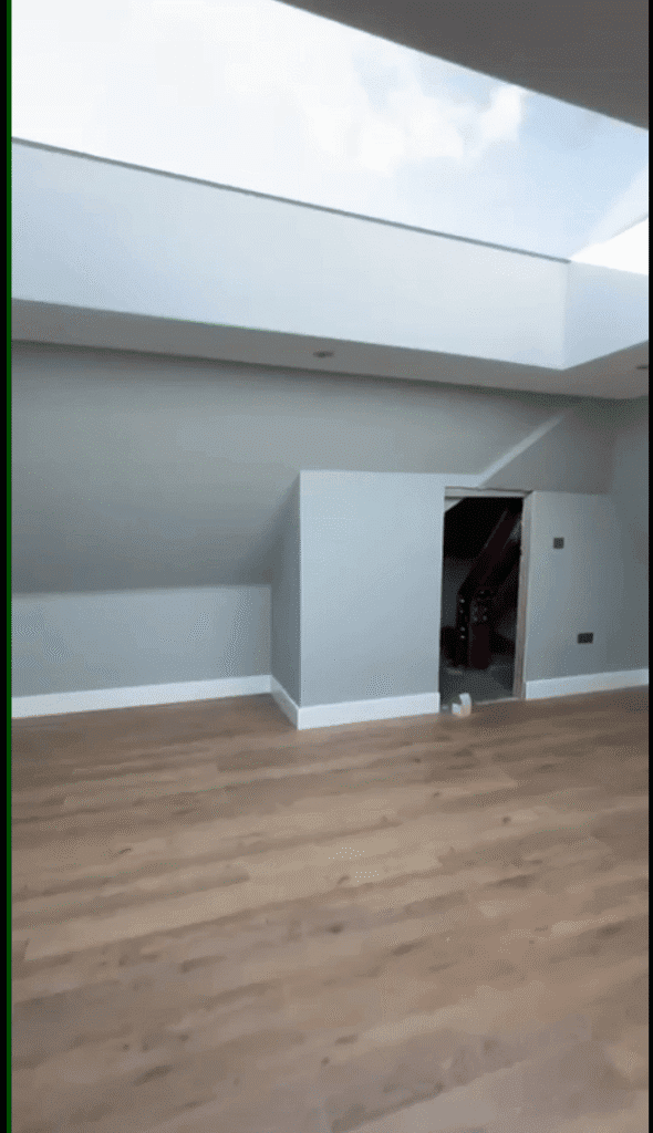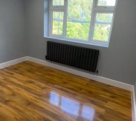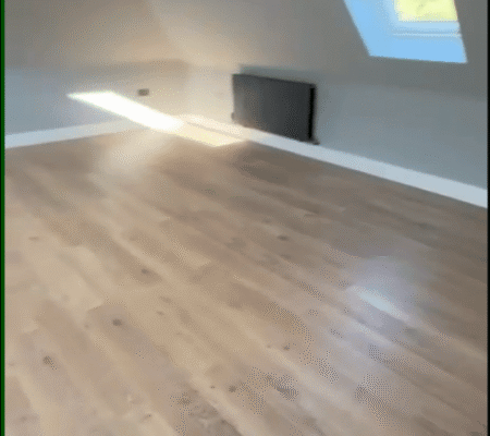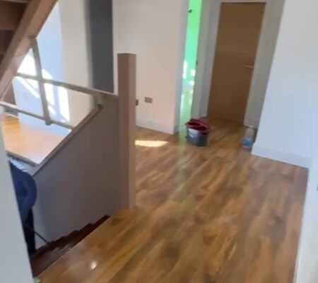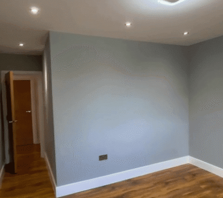 Modern Aesthetics: A sophisticated palette of cool grays and crisp white skirting is complemented by high-quality oak-style flooring, bringing warmth and texture to the minimalist design.
